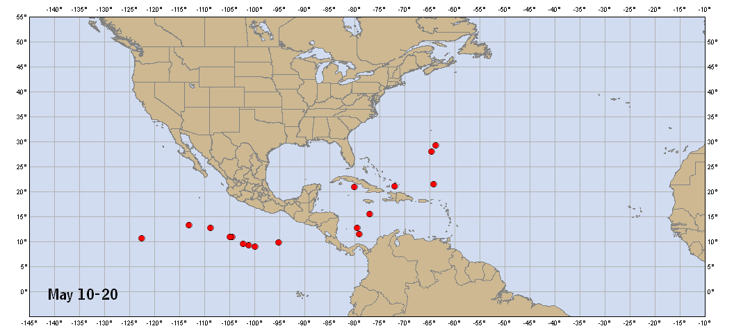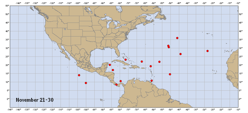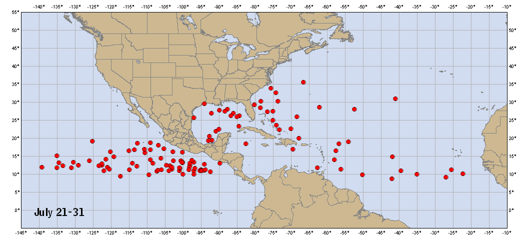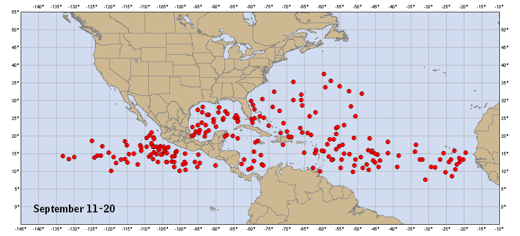The figures below show the points of tropical cyclone genesis by 10-day periods during the hurricane season. These figures depict named storms only; no subtropical storms or unnamed storms.