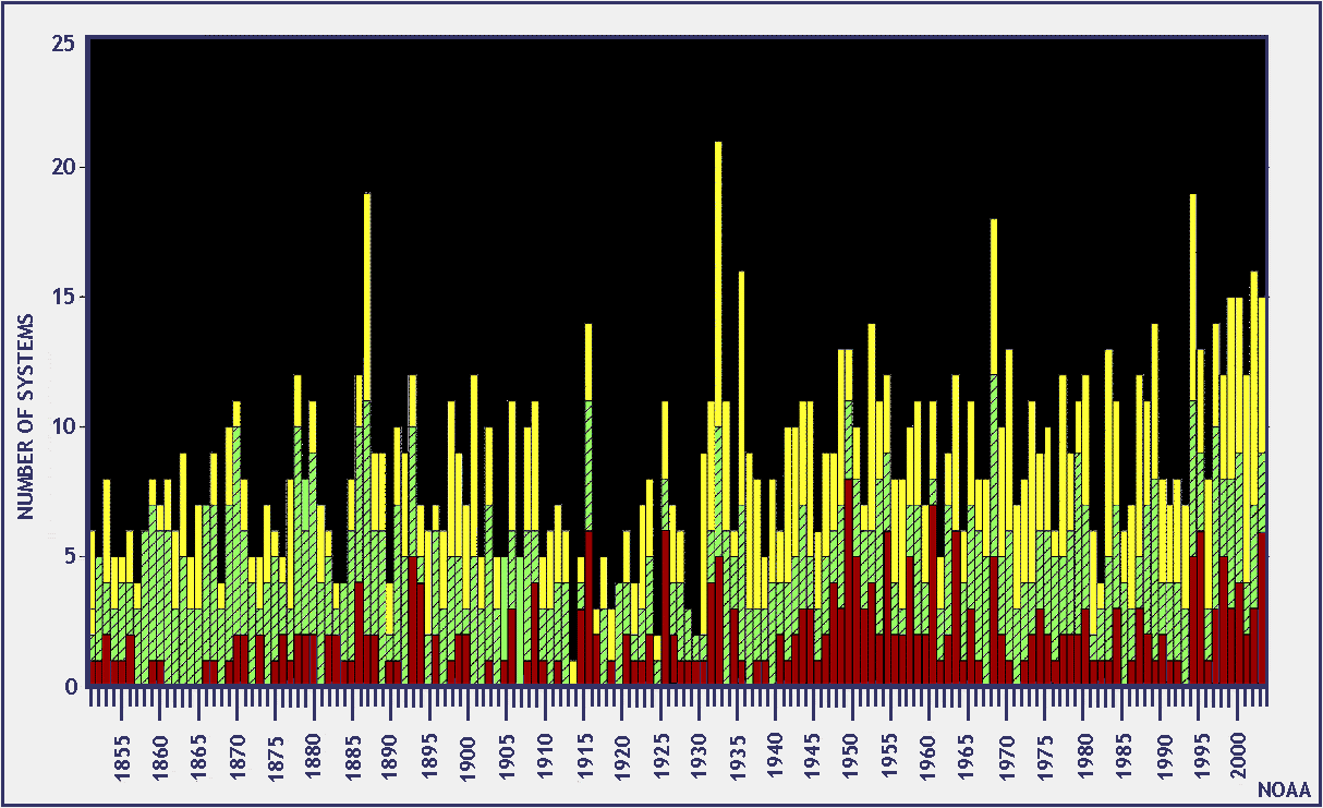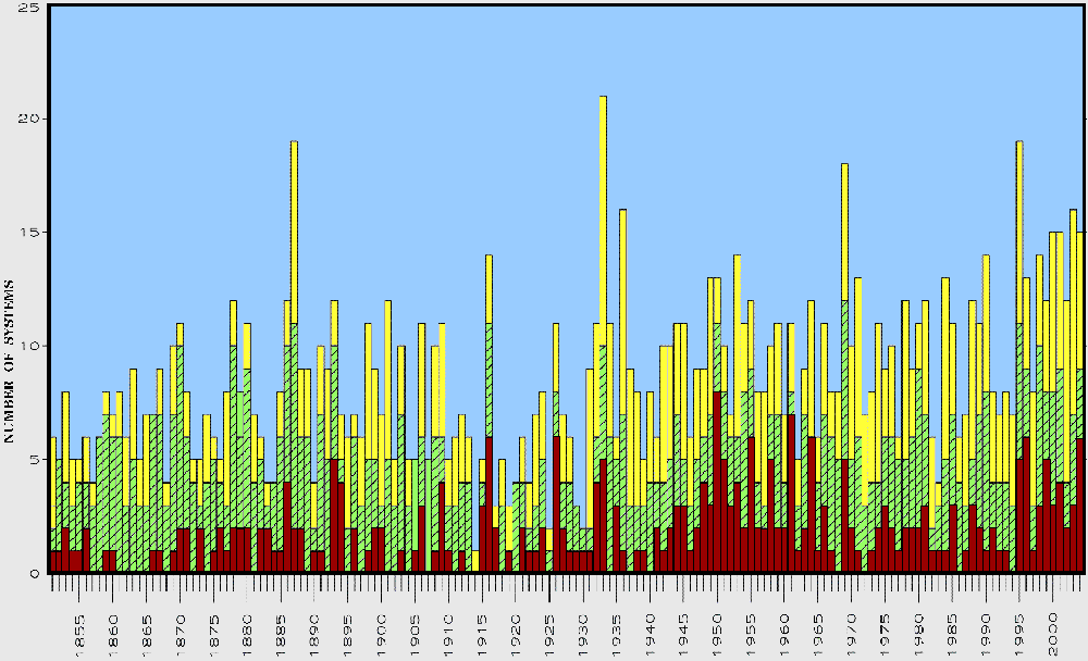 hurricanes (hatched/green), and category 3 or greater (solid/red), 1886-2004