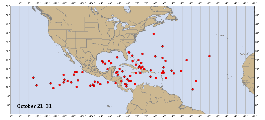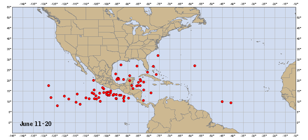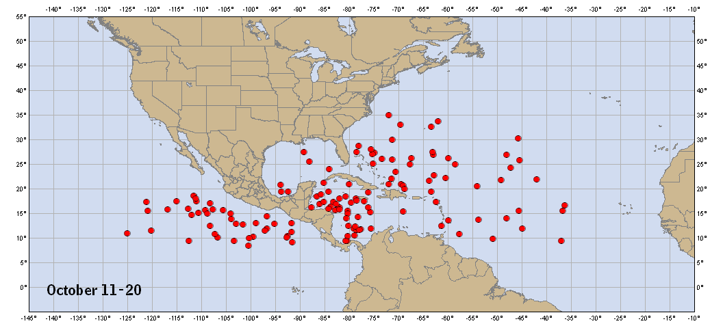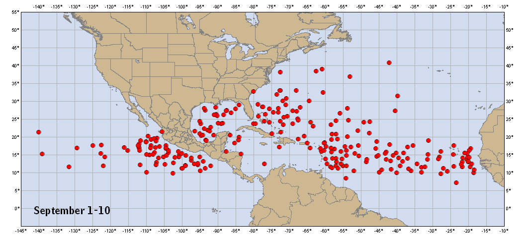 The figures below show the points of tropical cyclone genesis by 10-day periods during the hurricane season. These figures depict named storms only; no subtropical storms or unnamed storms.